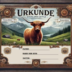 Mit einer Patenschaft helfen Sie mit, die artgerechte Haltung unserer Hochlandrinder zu sichern und den ökologischen Kreislauf zu stärken. Sie erhalten exklusive Einblicke in das Leben Ihres Patentiers, können es auf der Weide besuchen und bekommen eine hochwertige Patenschafts-Urkunde auf einer Metallplatte.